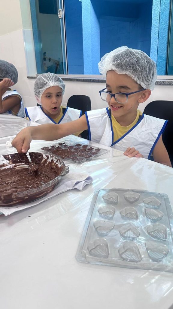 Como parte desse projeto, os alunos do 2º período, sob a orientação da professora Mary, participaram de uma aula de culinária na qual confeccionaram ovinhos de Páscoa. Durante a atividade, as crianças tiveram a oportunidade de vivenciar experiências práticas que estimularam a coordenação motora, o trabalho em equipe, a organização e o respeito às etapas do processo, além de desenvolverem a autonomia e o senso de responsabilidade.
